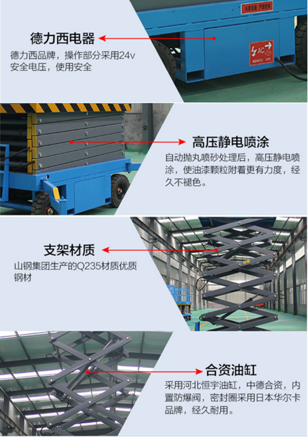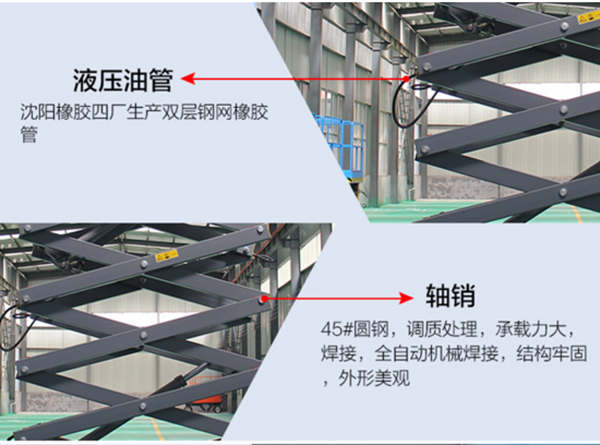升高4——22米,載重0.3—3噸。采用意大利和國產液壓泵站,臺面使用防滑絕緣扣板,具有防滑,絕緣、安全,請放心使用。它使高空作業效率更高,安全更保障。